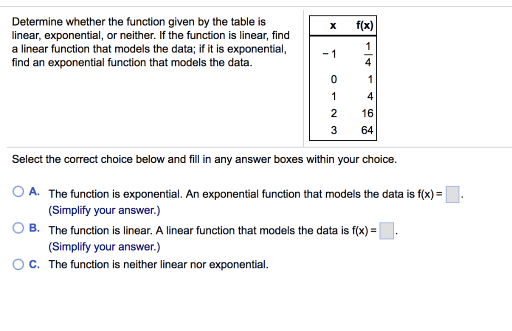 An equation where every independent variable is only raised to the power of one. To determine whether the given function is linear, exponential, or neither, first compute the average rate of change of with respect to and then compute the ratio of the consecutive outputs. See full list on ck12.org Therefore, the function is linear. What is the difference between linear and exponential functions?